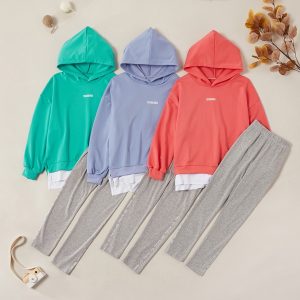 Sporty Solid Faux-two Hooded Sweatshirt and Pants Sets