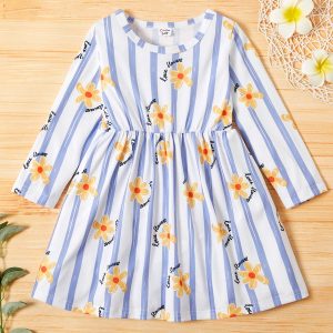 Toddler Girl Floral Print Striped Ruffle Long-sleeve Dress